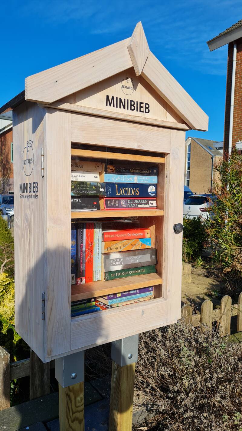 Bij de Minibieb Notarisappel in Andijk kun je gratis boeken lenen. Er zijn ook boeken die je mag houden en/of omruilen.